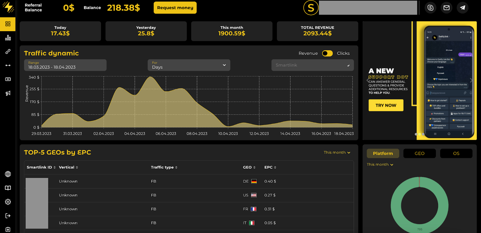 Smartlinks usually provide affiliate programs such as Datify.Link. This is CPA affiliate marketing platform that leverages the power of Smartlink technology to help marketers maximize their earnings. The platform offers various features and benefits, such as: